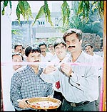 staff & dealers at "cutting the ribbon" ceremony to signal the commencement
